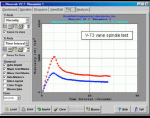 THIẾT BỊ KIỂM TRA• Kiểu máy đo độ nhớt: HB-• Kiểu spindle: V-73• Phụ kiện thêm: (không có)• Tốc độ kiểm tra: 1 rpmCách tiến hành:Các thử nghiệm được chạy ở nhiệt độ phòng. Sử dụng spindle kiểu Vane là tương đối mới, trong các ứng dụng tại bộ phận QC. Thử nghiệm này có thể được coi là hơi phức tạp hơn so với quy trình Helipath tiêu chuẩn được mô tả trong Bảng ứng dụng theo phương pháp 1. Việc thu thập dữ liệu tự động có thể được thực hiện với bất kỳ Máy đo lưu biến DVNext hoặc Máy đo độ nhớt DV2TRV, và với phần mềm Rheocalc (T). Dữ liệu điển hình từ việc so sánh hai sản phẩm khác nhau, sản phẩm loại “A” và “L” được hiển thị dưới đây: