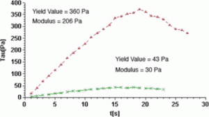 Sự khác biệt giữa hai vật liệu là đáng kể. Mayonnaise kiểu A có phản ứng được đưa ra bởi đường cong màu đỏ, có giá trị độ nhớt cực đại cao hơn nhiều so với Mayonnaise L, có phản ứng được đưa ra bởi đường cong màu xanh. Đỉnh cao hơn này tương ứng với một Yield stress cao hơn. Độ dốc ban đầu của đường cong Độ nhớt theo thời gian là lớn hơn đối với mayonnaise A so với mayonnaise L. Giá trị độ nhớt cuối cùng của A cao hơn giá trị của L. Những dữ liệu này phản ánh kết cấu bền vững của sản phẩm.PHƯƠNG PHÁP 3
