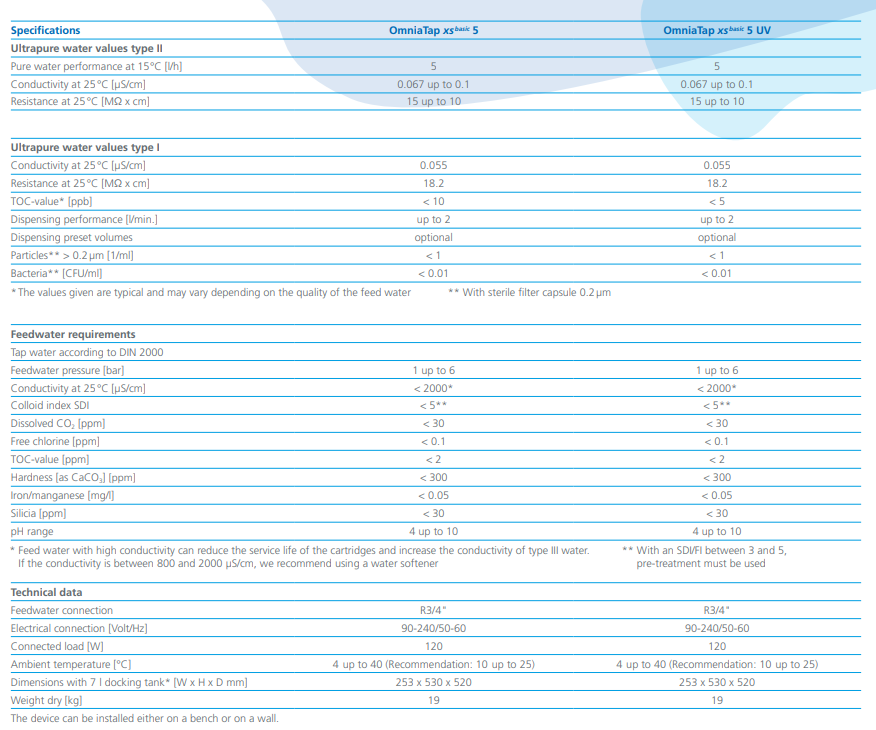 THÔNG SỐ KỸ THUẬT CỦA MÁY LỌC NƯỚC SIÊU SẠCH LOẠI I+II OmniaTap xs Basic